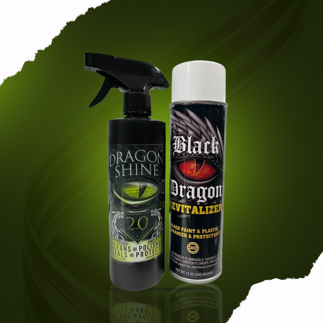 Dragon Shine 2.0 & Black Dragon Revitalizer duo offers a complete solution for cleaning, polishing, sealing, and protecting your vehicle. Dragon Shine 2.0 Cleans seals, polishes and protects. While Black Dragon Revitalizer enhances your Engine and protects black paint and plastic surfaces.